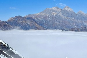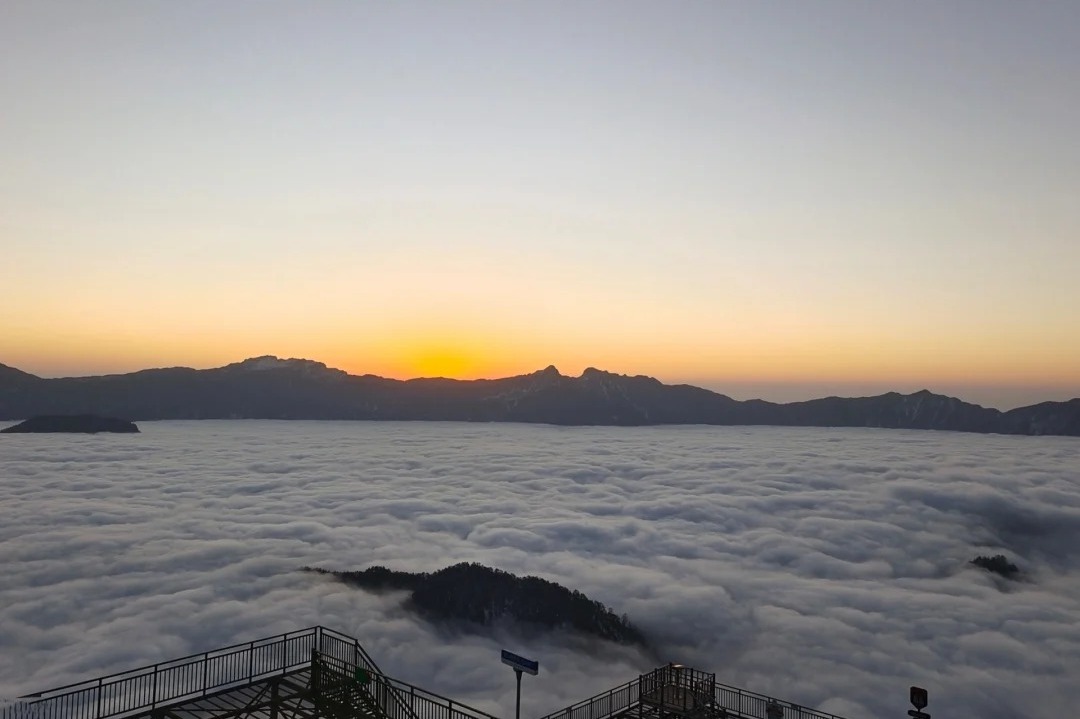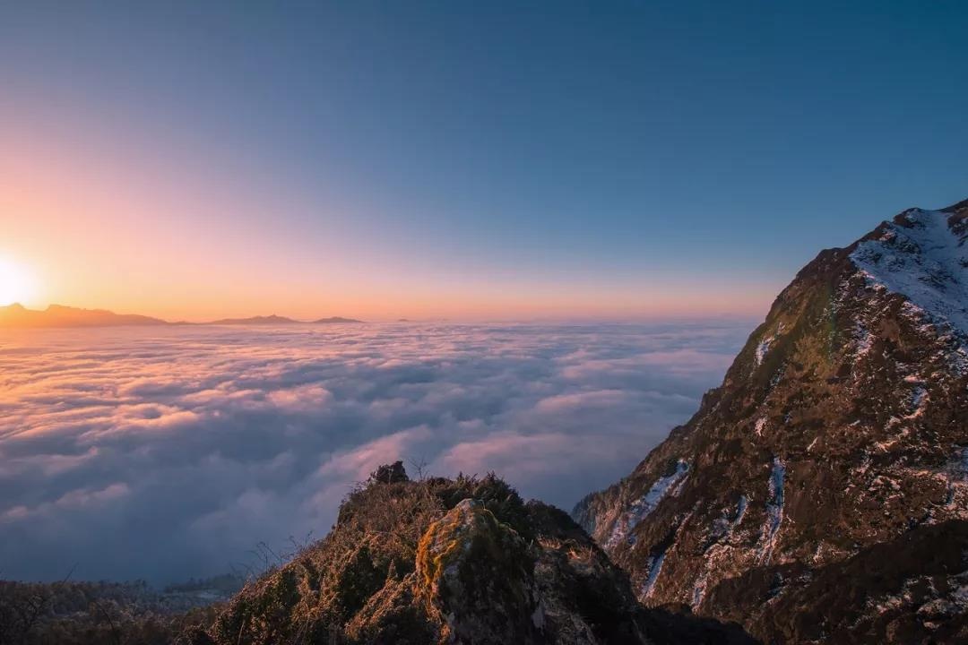 在海拔3700多米的焦山观景台,一眼望去看到的是远方群山山巅与自己视线齐平,极目远眺,群山逶迤,对面的山巅也好似一叶扁舟,在茫茫云海之中显得渺小而静谧,四下里云海翻滚,