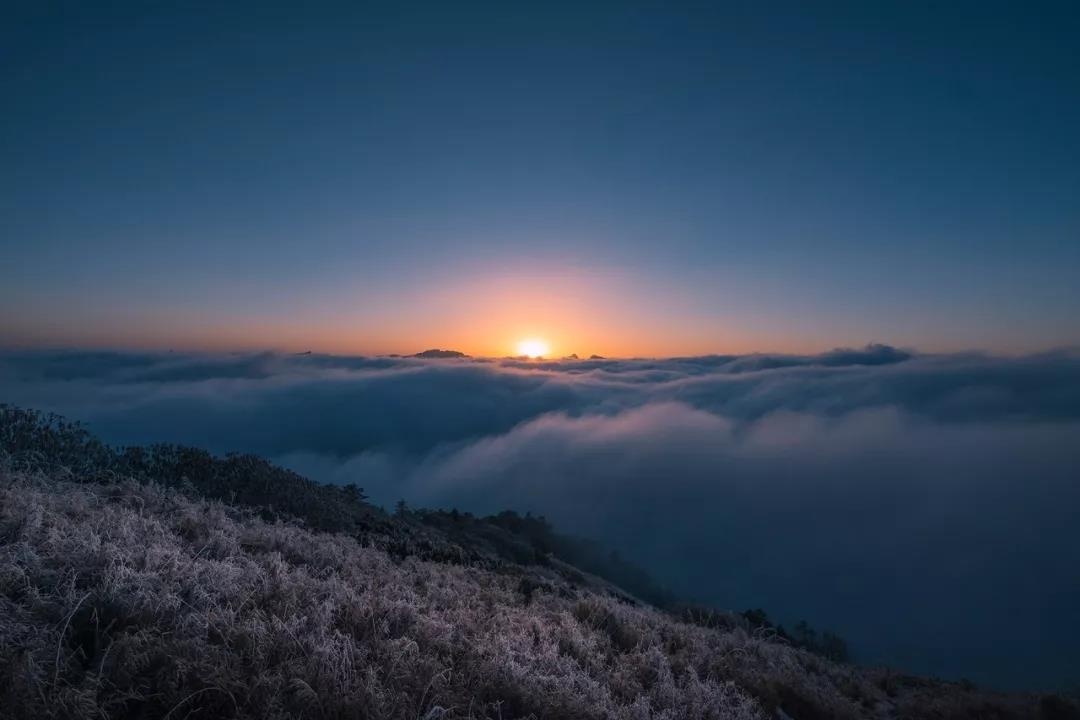 此时,一轮红日从对面山峰慢慢升起,山巅轮廓被勾勒得清晰可辨,朝阳挣脱山巅的一刻,万丈霞光倾泻在云海上,为这一望无垠的云海披上了金装。