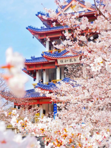 簇拥着花海中唐宋风格的赏樱阁