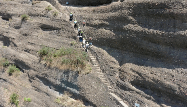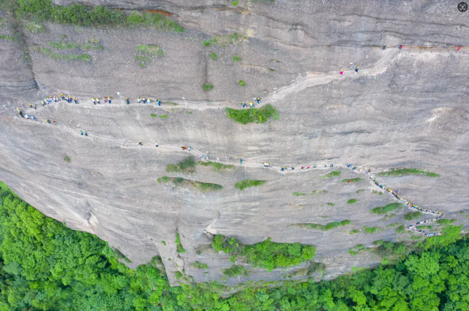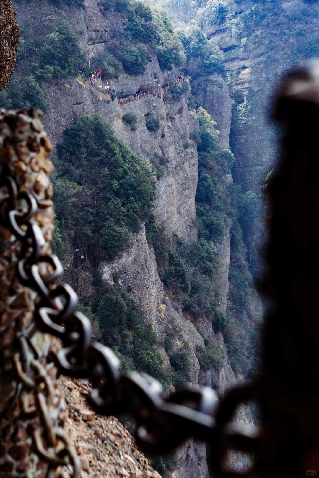 和鸟道相比,猿猱道更为险峻,这里没有护栏,路面也更狭窄,攀登者仅靠腰间的安全绳,与手中的铁扣扣住铁索,单人单向缓慢前行。