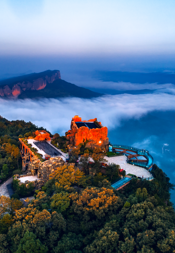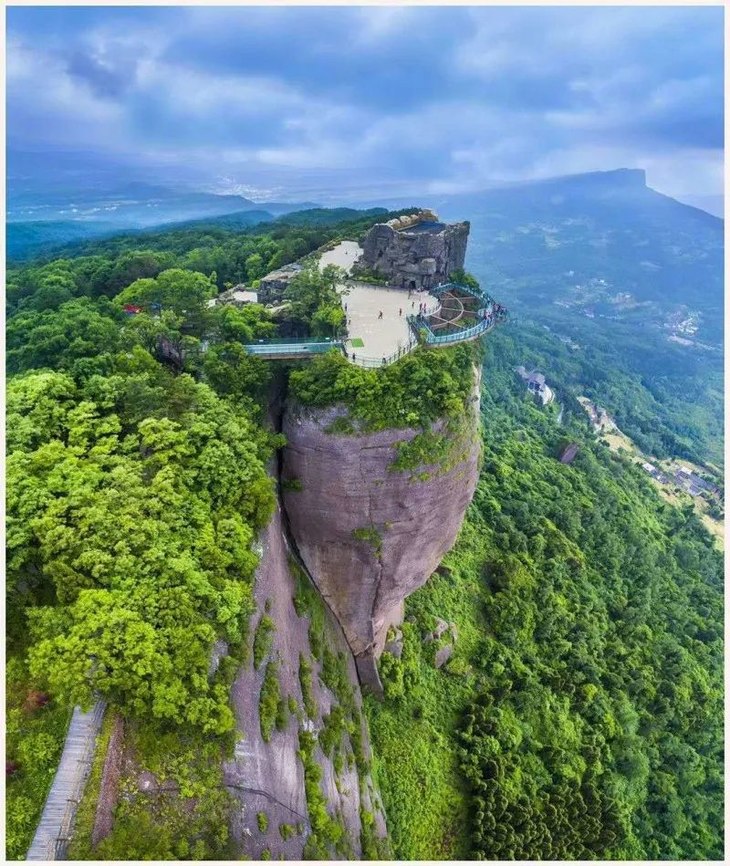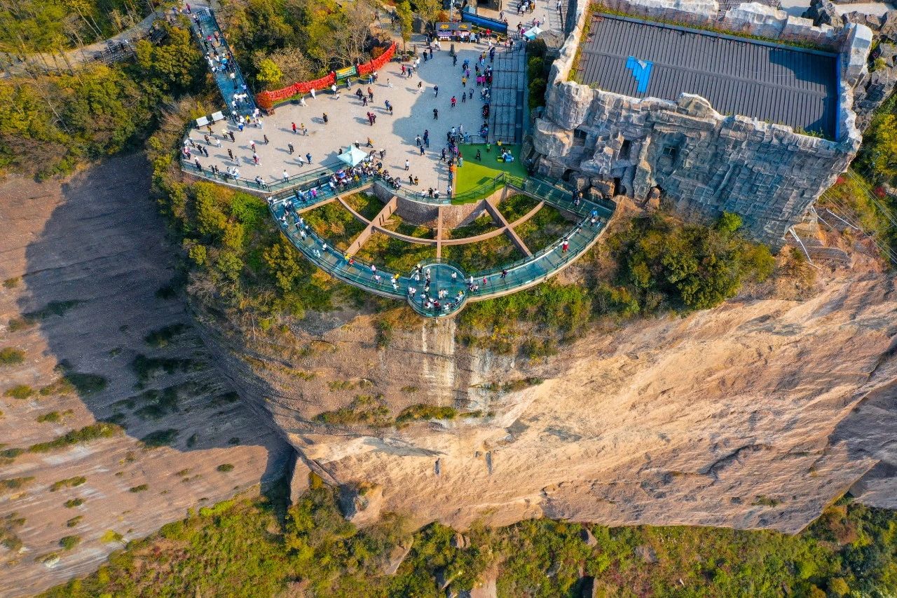 玻璃景观平台,位于剑门关景区的最高点,由一段长60米、宽2米悬于峭壁之上的半弧形玻璃栈道和一条长24米、宽3米横跨两峰的玻璃桥组成。