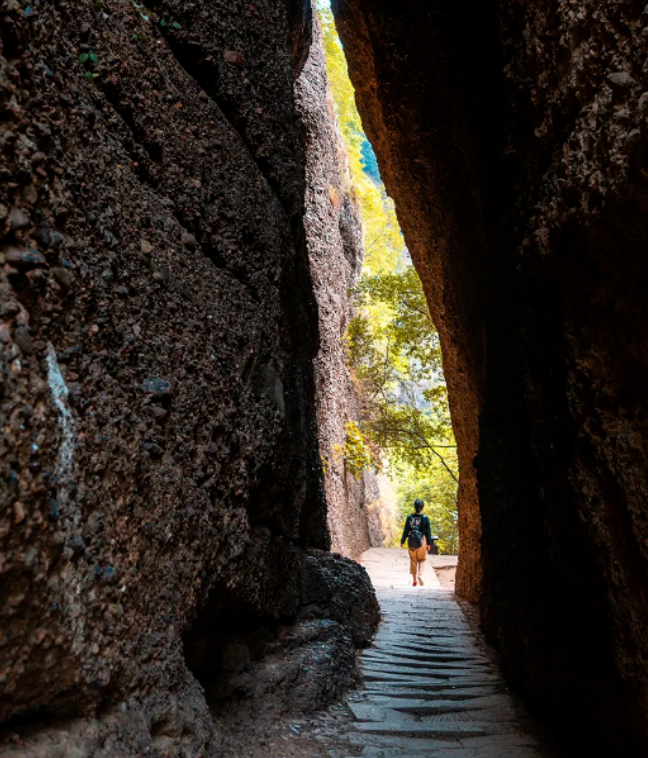 还可以体验一下“一线天”,一线天又名宝剑岩,仅容一人侧身而过,两岩所留缝隙好似一柄宝剑剑柄朝地,在逆光效果下,剑身闪闪放光,让人忍不住赞叹自然的鬼斧神工。
