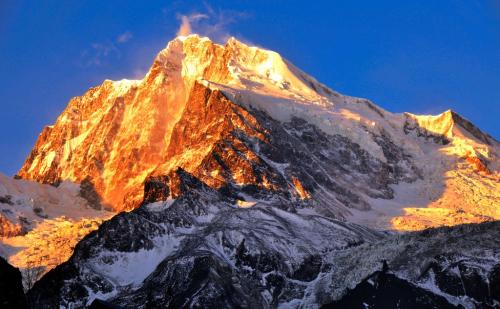 五月开始,冰川就会慢慢消融,形成造型奇异的冰川风景景象,具有很高的观赏价值。当遇上晴朗的天气,还可以看见日照金山,金光灿灿,耀眼夺目。