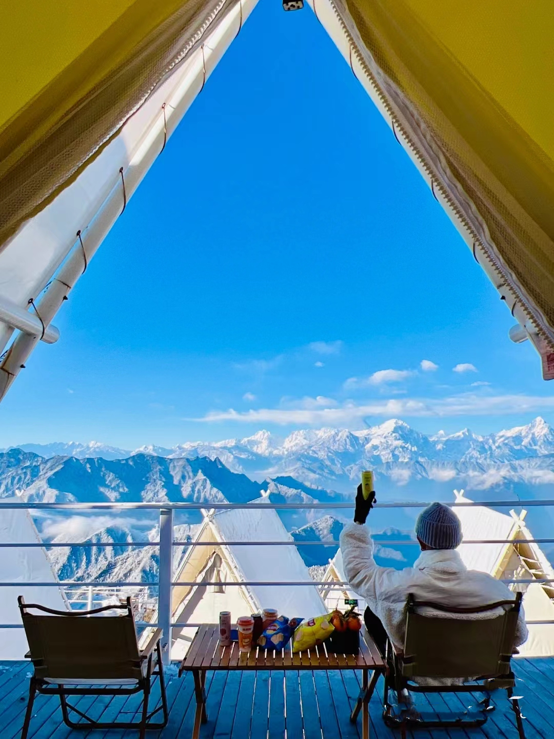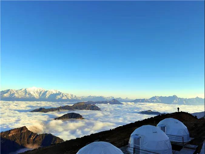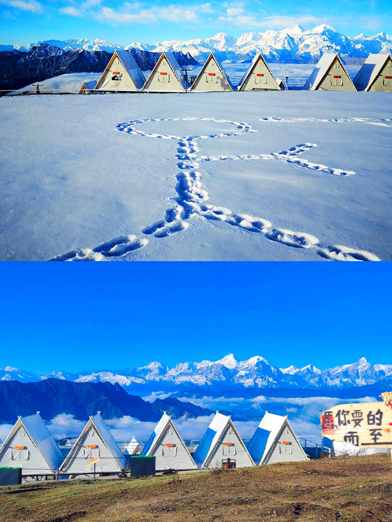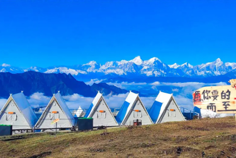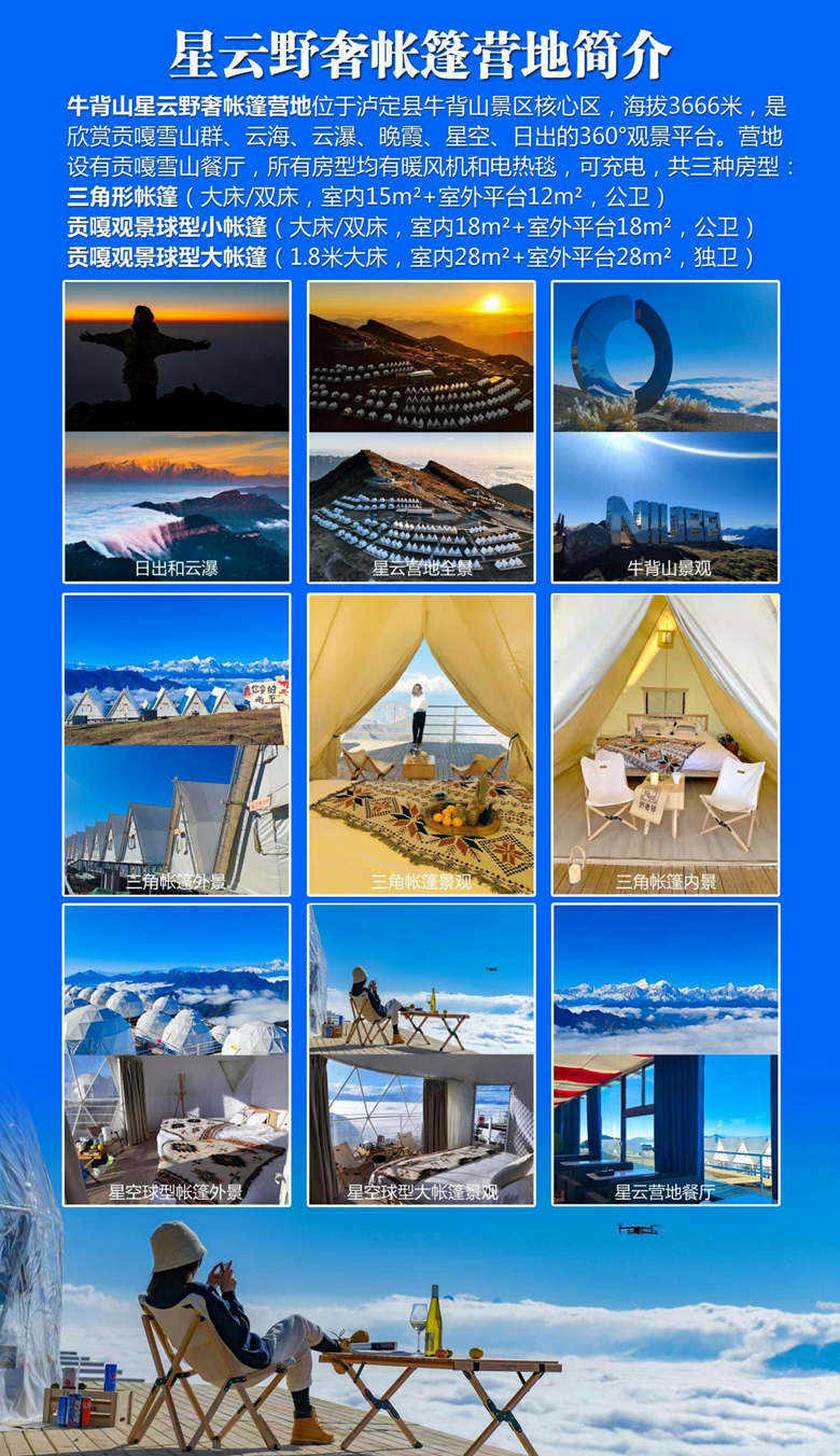 早上集合点准时出发,领队车上组织大家相互认识,一路高速直达泸定,预计11:30左右抵达泸定冷碛镇,在镇上AA午餐后前往牛背山景区长海子停车场(中转费往返100元)。换乘景区观光车上山(往返80元),然后徒步约1.8公里到达山顶(观光车下车后,也可以选择卡丁车上山,单边2人140元,4人260元,供参考),安排住宿后,跟随领队拍摄雪山大片。晚餐可以去在牛背山的贡嘎雪山观景餐厅享用热气腾腾的牦牛肉汤锅(自理,可代订)。晚上入住牛背山三角帐篷20平米标间,带【24小时暖气】【带电热毯】,有露台,不带卫生间,卫生间为公用,有【热水供洗漱】,也很干净)。晚上银河升起,大家自行观星,躺在星空下,浪漫至极。(可升级住宿,报名时联系客服)