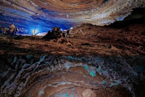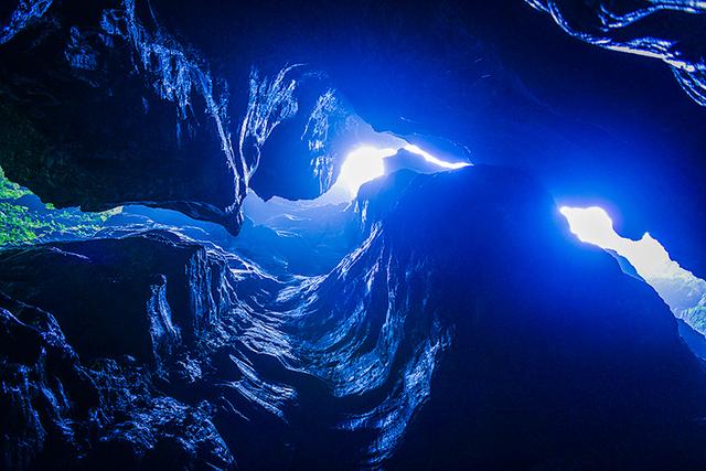 洞穴天坑从下向上拍,形状酷似宝岛台湾,妙不可言,无不感叹大自然神奇之处。区岩溶地貌种类齐全,石瀑布、石旗、卷曲石、石膏晶花等形态随处可见,如琼楼玉宇、雪树银花,是国内仅有、世界罕见的地质奇观。