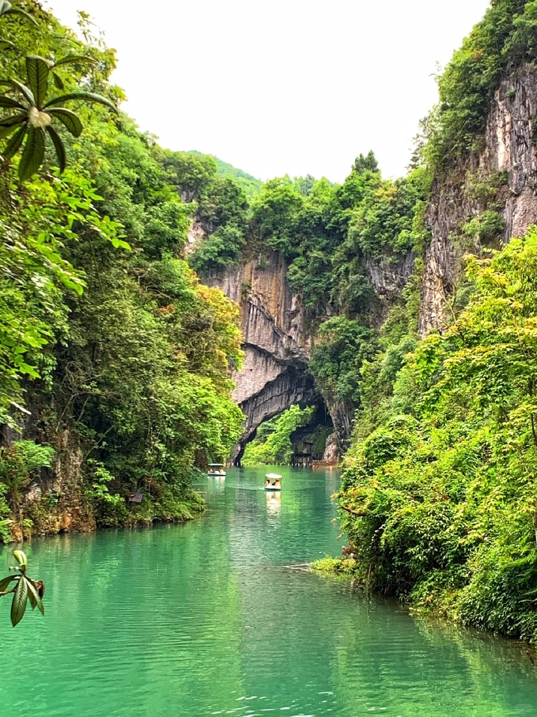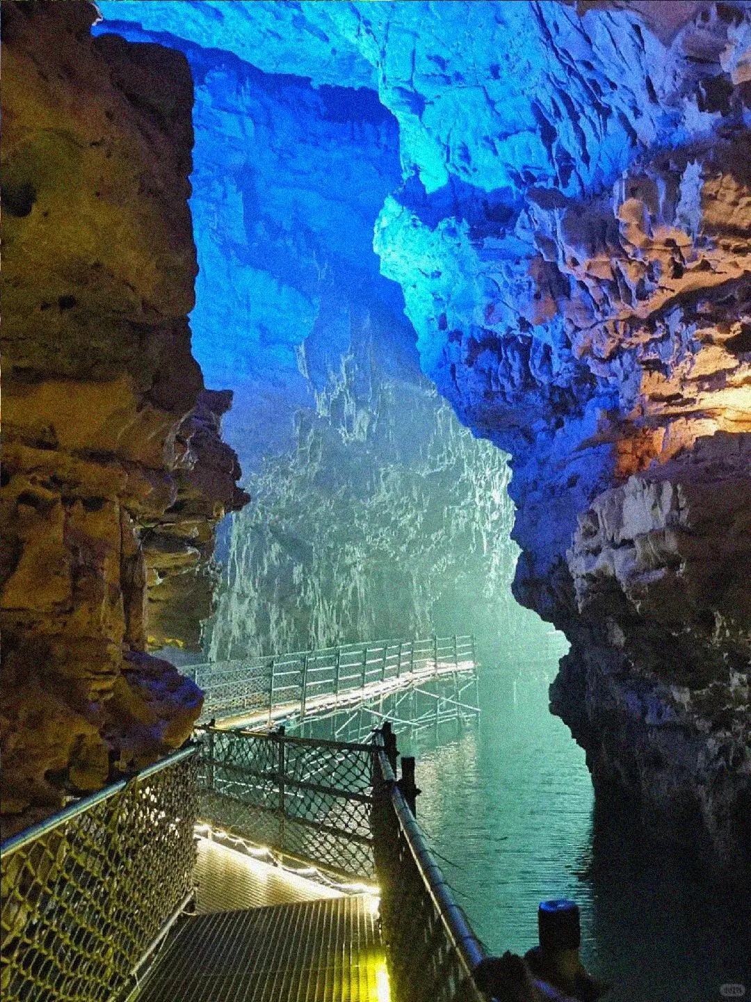 地下河谷,石壁造型多纹路美艳,河水碧绿深幽,仿佛世间最伟大的艺术臻品。洞内还有盲鱼、野生娃娃鱼等罕见的洞穴生物。