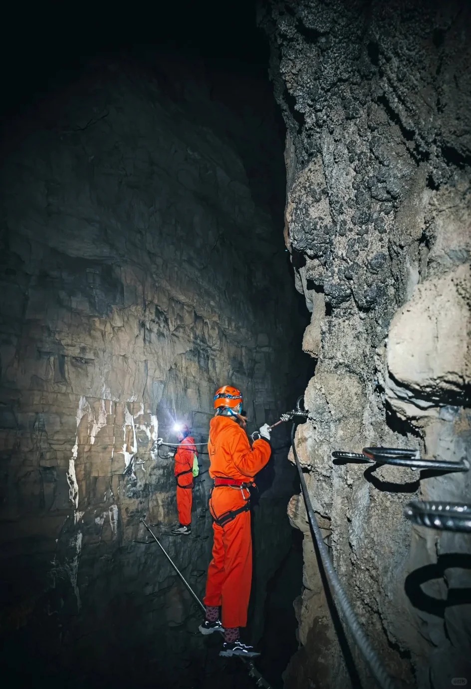 国内首创洞穴飞拉达软探险项目,仅靠头灯这一小小的光源,可见范围就几米,其他地方真的就是一片漆黑。洞穴飞拉达全长450m,一路攀升,含装备,教练,时间3小时,过程包含了12m悬空绳降、30m悬空竖井绳降等等。