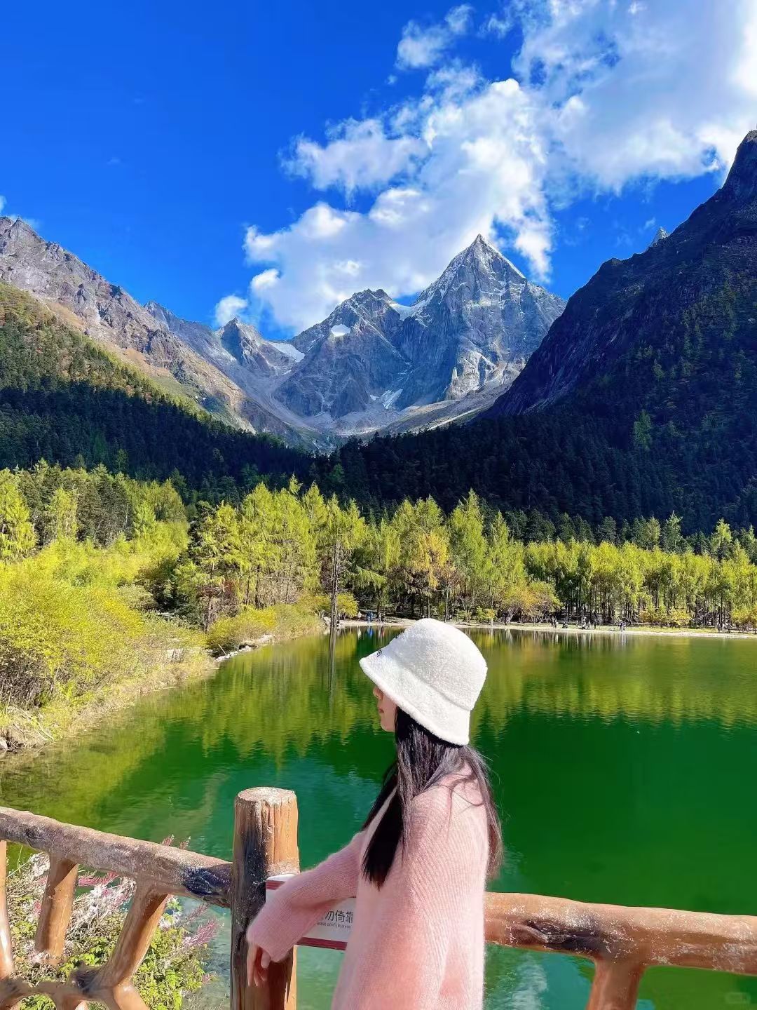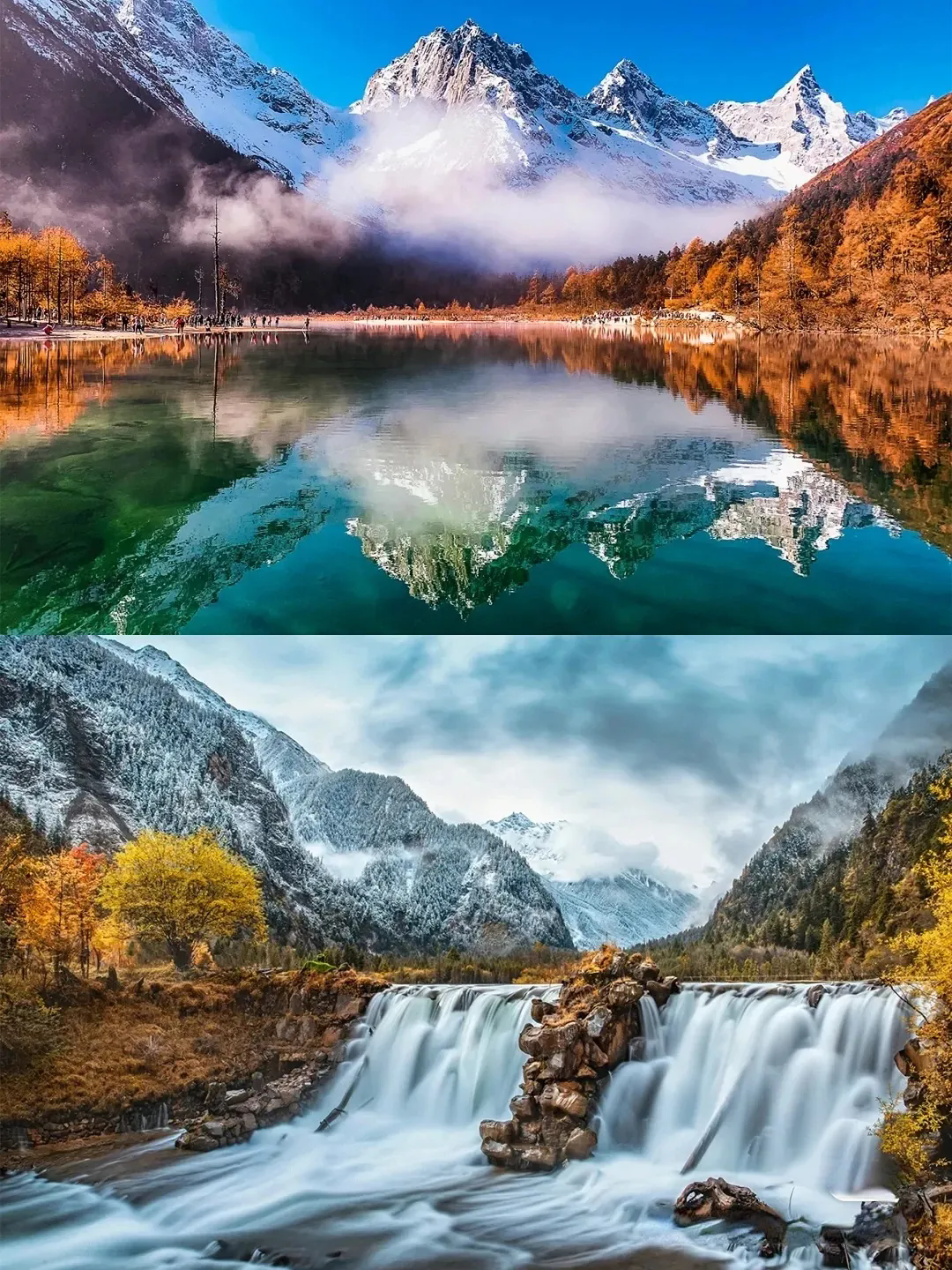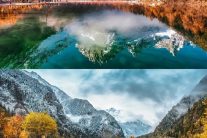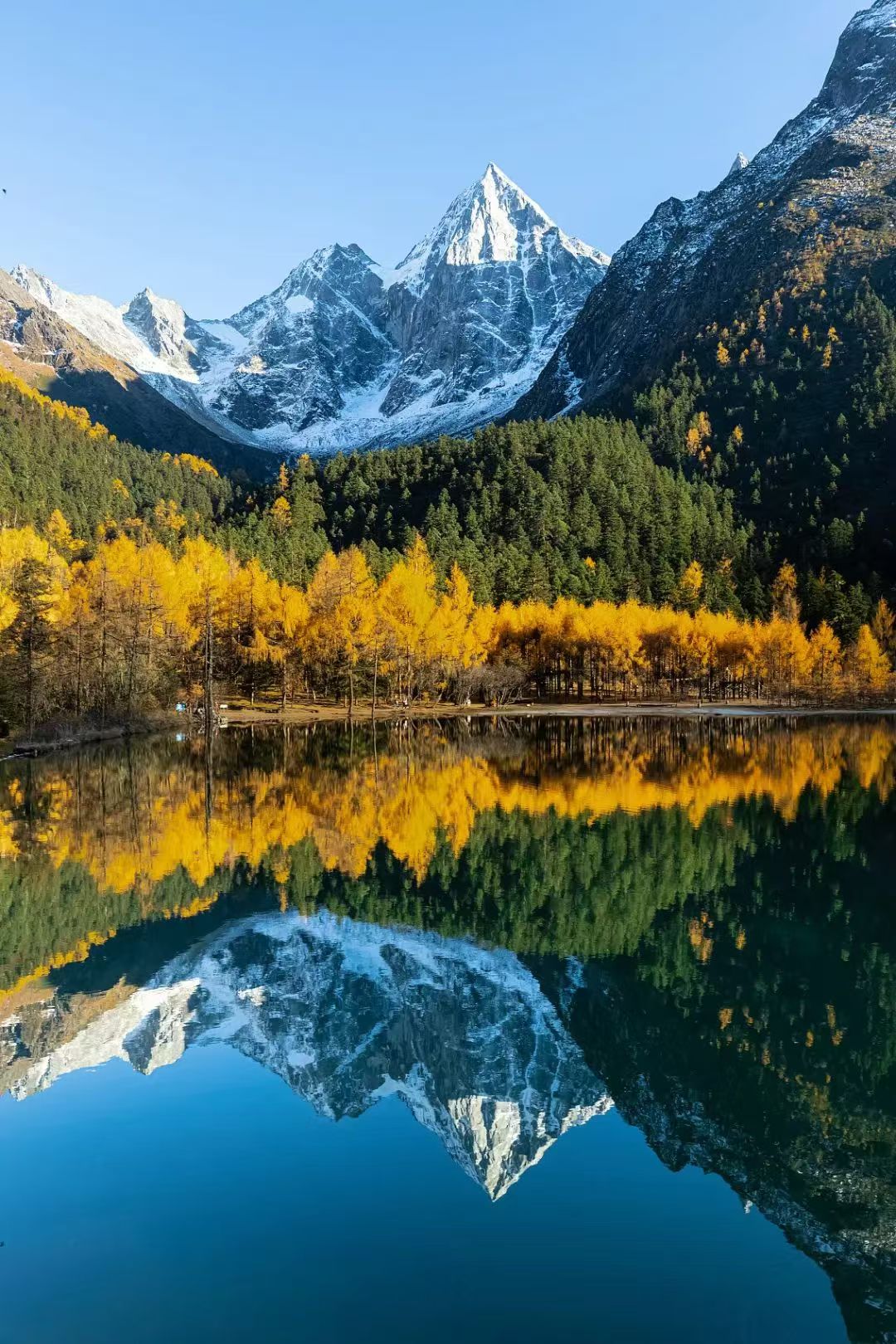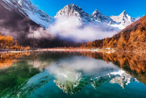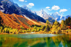 秋季的毕棚沟更是美成了童话世界,湛蓝的天空,洁白的雪山,五彩的森林,金黄的草地,碧绿的海子……美轮美奂,如同走进了油画里。