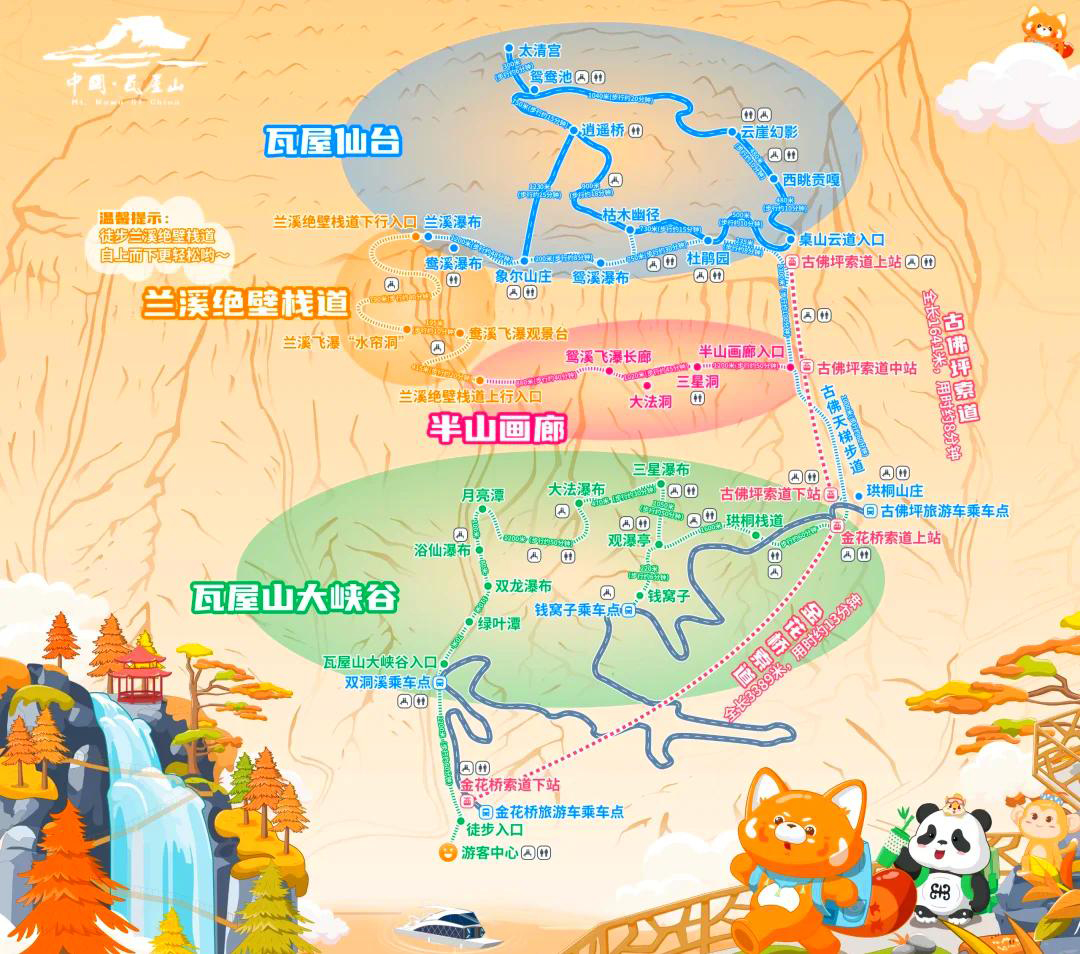 注意:瓦屋山兰溪绝壁栈道及半山画廊游线道路暂停开放,(B线路古佛天梯可正常徒步)