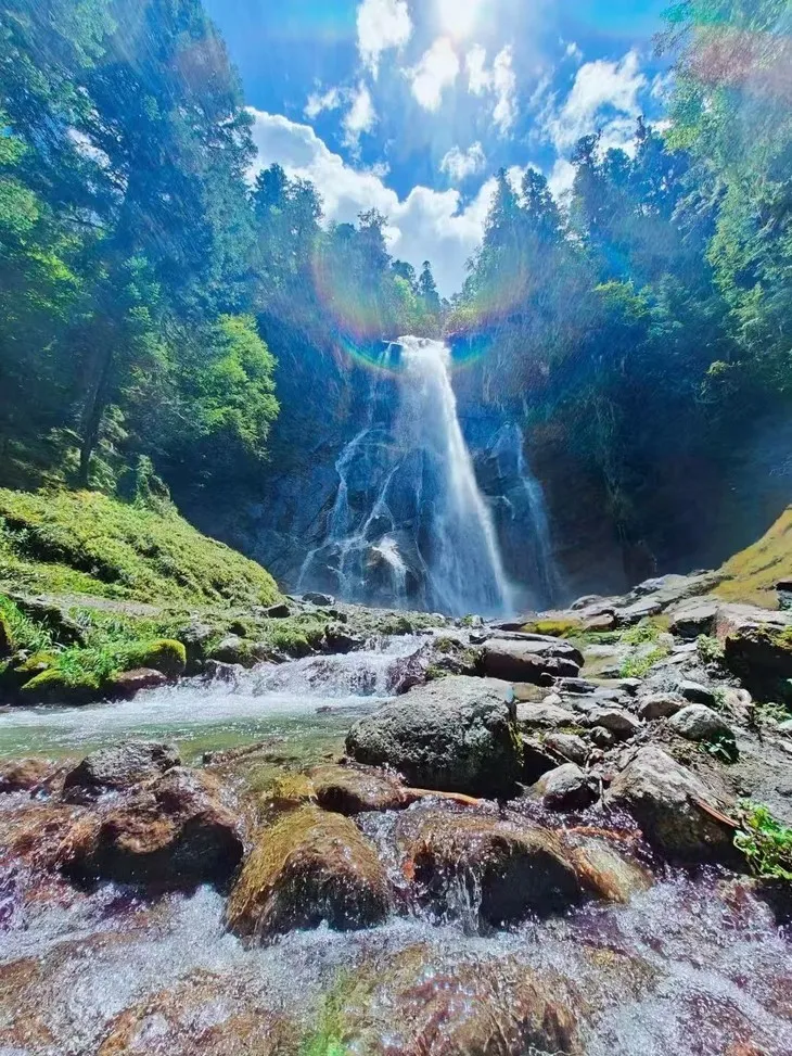 这里是理小路精华景点之一:网红瀑布位于凉台沟红石滩附近,在理小路上,远远地就可以看到,这样一条水蛇长龙悬挂山际,夏季水流量起来更为壮观。依着小河顺水而过,来到瀑布下面凉意十足,绝对让你忘记夏天的味道。之后跟随领队前往红石滩简单停留,近距离感受雪山脚下的红色石滩,随后继续沿着理小路前行。