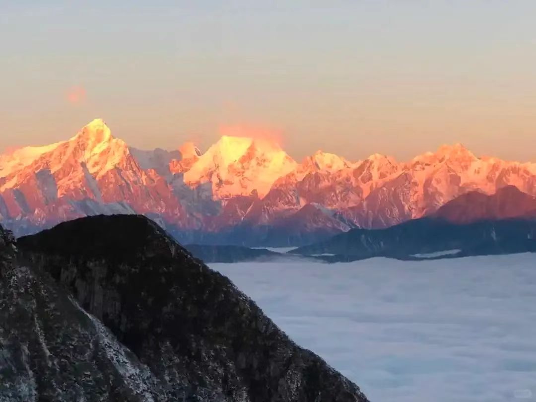 早起迎接第一缕曙光,因为娘娘山的日出,绝对值得你牺牲一点睡眠。5点半左右起床,徒步1.5小时左右到山顶小包岭(建议携带登山杖,单边4公里,爬升400米)(不想爬山的可客栈观景无需远行,推门即享日照金山视觉盛宴),东观云海日出、西照贡嘎金山,霞光万顷、佛光彩稠,四面云海、四面环山、景色迷人,此时此刻尽情领略娘娘山的美丽风景,继续消耗所有相机内存。在山顶合影留念,观景结束后返回客栈享用热腾腾的藏式早餐,预计10:00左右换乘接驳车(中转费自理,必须)返回冷碛镇换乘俱乐部豪华大巴启程成都,预计19:00抵达成都市区集合点解散。