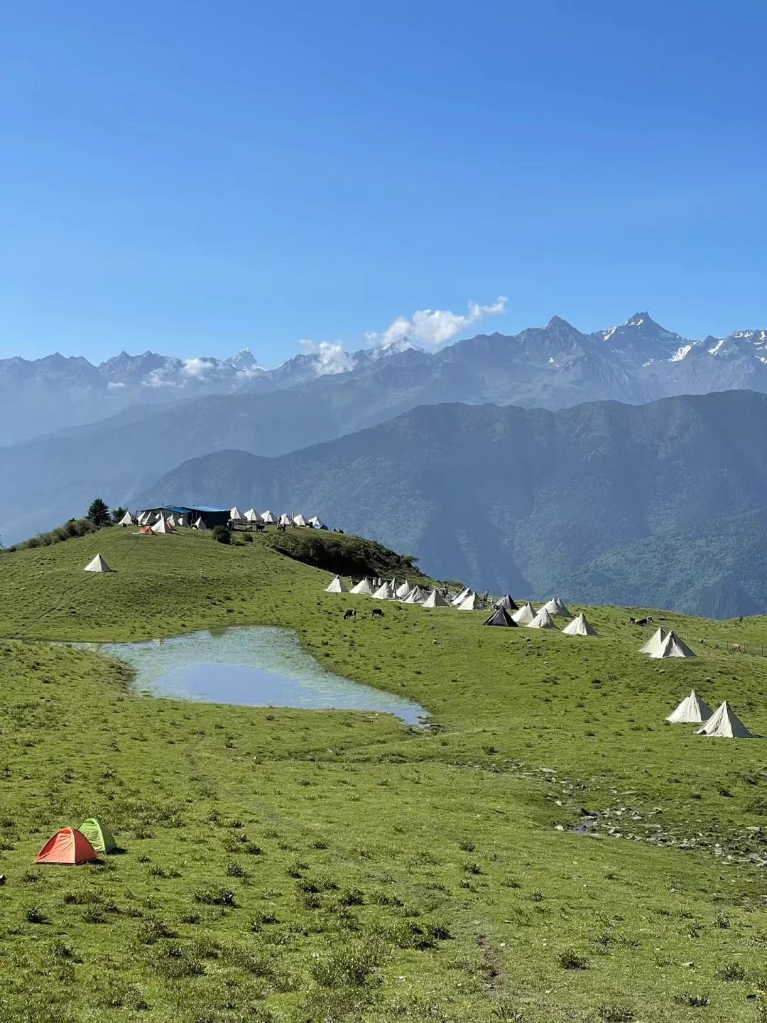 自行早起,安排时间看日出云海,或继续睡个懒觉。看完日出后自由活动,畅游高山草甸,色彩缤纷,你可以躺在草地上打滚或发呆、享雪山蓝天,浪漫而壮阔!差不多时间就回到营地吃早餐(稀饭、馒头、榨菜之类)。早餐后,拔营(请收拾好装备),集体合影,最迟上午10点由领队带领沿昨天上山之路原路返回至徒步起点转乘当地中转车至大巴车处签到上车返程,午餐沿途寻觅一家地道餐馆(比如牛肉汤锅等),预计19点到达成都解散,结束愉快的行程。返程中大家相互分享今天拍的的照片,发个朋友圈,相约下一次的出行,结束美好的一天。