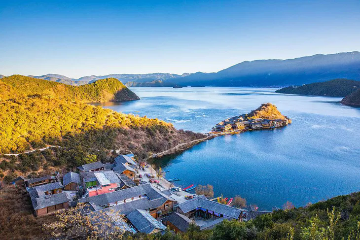 里格半岛位于泸沽湖的北侧,东西南三面环水,北面是与陆地接壤的一条小路,只有2米宽,走完小路就是一个白色的转山包,当地居民会从转山包的左侧进岛,然后会从转山包的右侧出岛,这样走就相当于绕着转山包转了一圈。岛上除了有当地居民几百年的古老住所,另外还分布着几家景色很棒的临湖客栈。