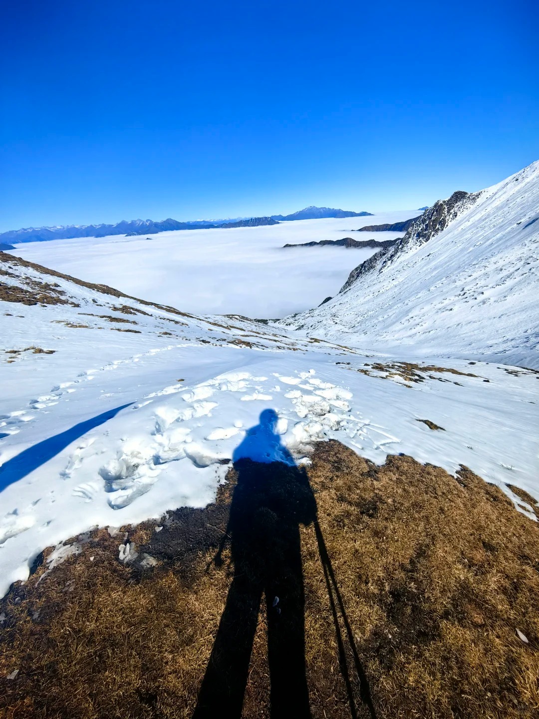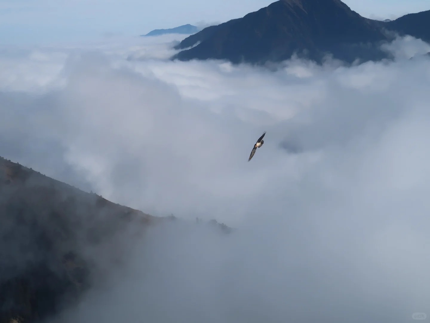 徒步经过草甸、灌木丛,极速爬升达到上方垭口登顶海拔4230米花林顶峰,即可遥望幺妹峰等众多远处雪山,云海尤为壮观,运气好的话还能看到佛光。