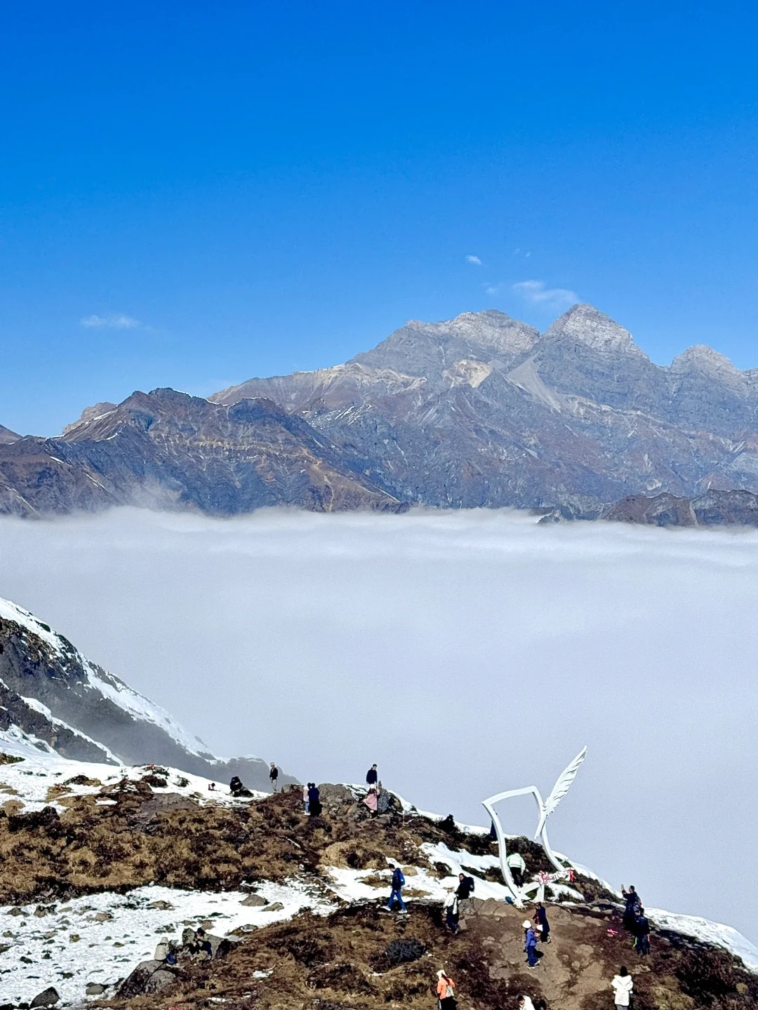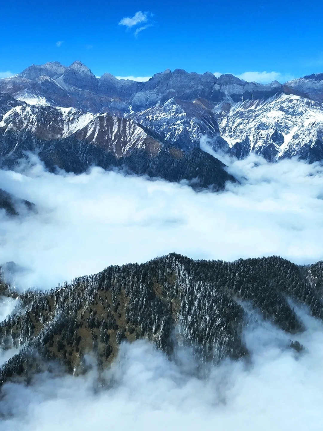 在海拔3700多米的焦山观景台,一眼望去看到的是远方群山山巅与自己视线齐平,极目远眺,群山逶迤,对面的山巅也好似一叶扁舟,在茫茫云海之中显得渺小而静谧,四下里云海翻滚,