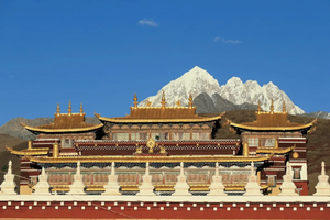 白色的藏房和金顶的寺庙在透蓝的天空下隐约可见,