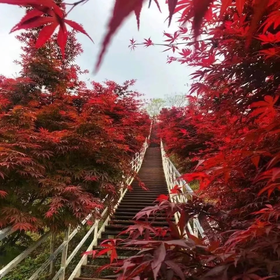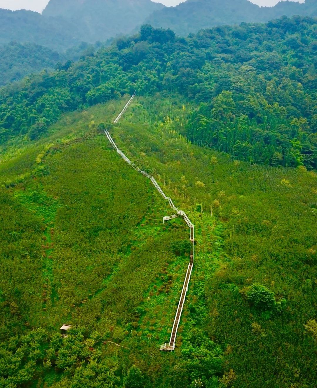 这里不仅有着一大片的深幽竹海,还有一段800米直达山顶的观景钢梯,让我们非常便捷地登高望远,众览群山。登上山顶,两条小径分左右而行,一边是丛生的原始森林,一边是葱郁的楠竹林,偶有群鸟飞过,叽叽喳喳的,显得幽静而生态。