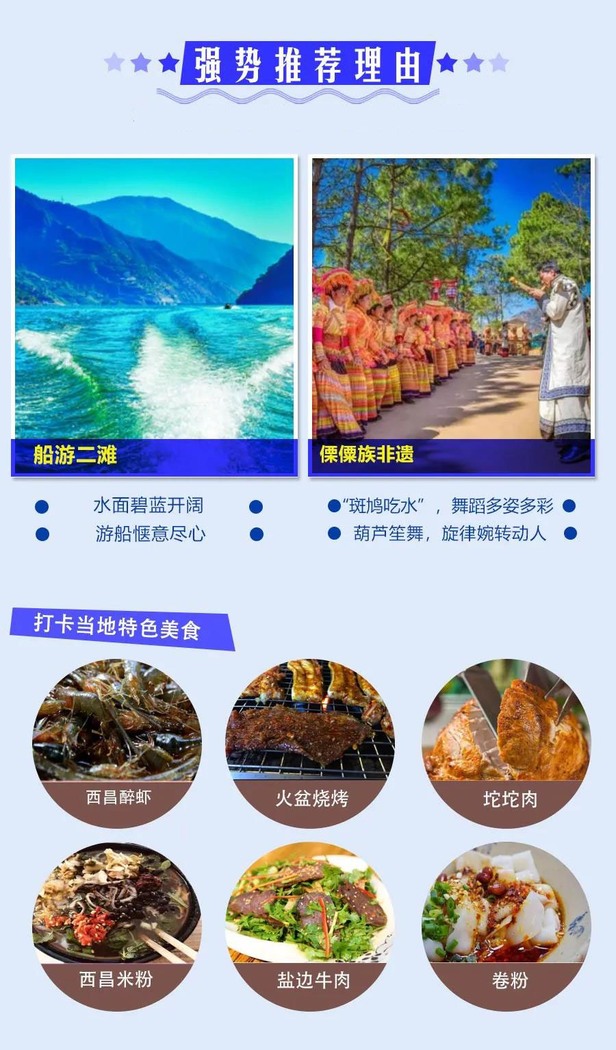 上午:早上自由活动,我们可以选择沿着邛海湿地闲逛,温润的空气直扑鼻腔,心旷神怡。去网红【月色风情小镇】打卡,邛海畔踏浪。或者前往泸山风景区。