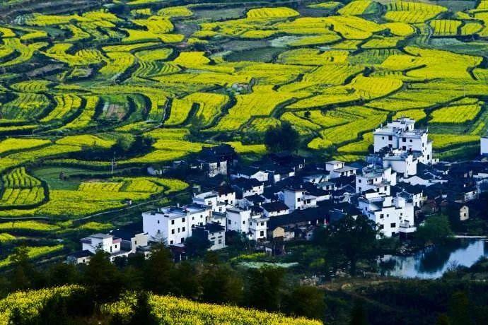 粉墙黛瓦的民居和金灿灿的菜花浑然天成