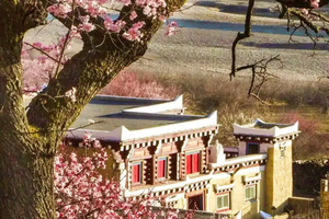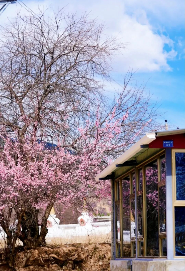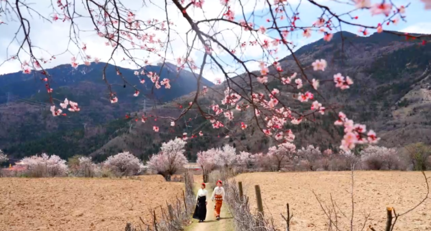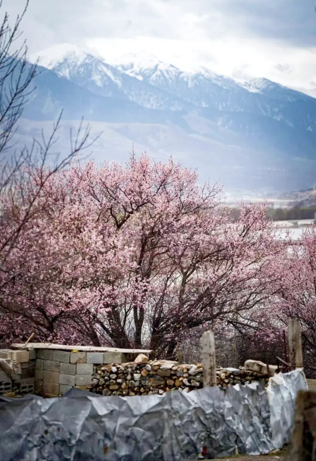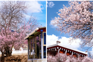 粉白杏花缠绕着白墙红壁的藏式民居