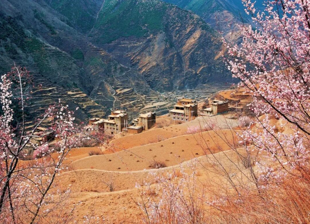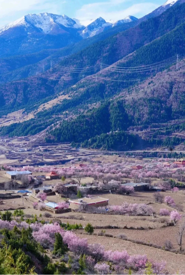 粉白花海、河谷溪流、藏乡风情相融合