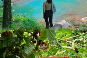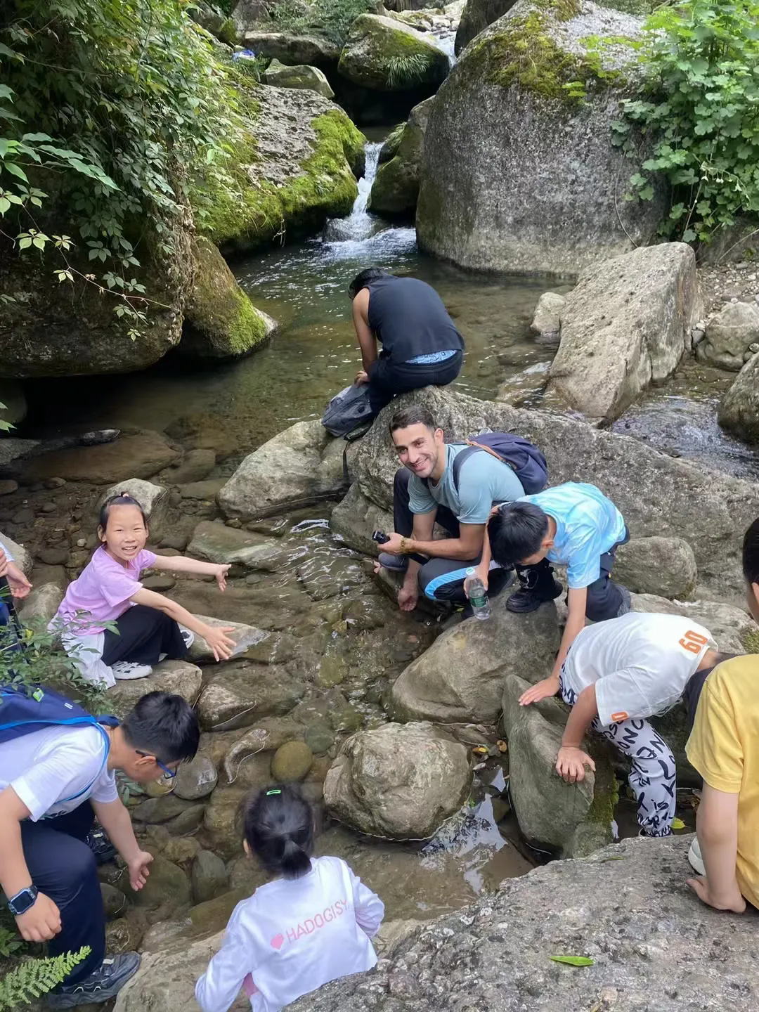 大家简单热身后,跟随领队的脚步开始徒步龙窝子,穿过山间小路、茂密的森林和小溪,沿途景色多样,徒步耍水,挖野菜。