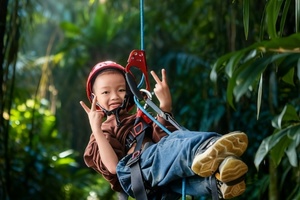 告别平地束缚,借助专业装备向上攀登,抓握岩点、借力发力,一步步攀上树梢高处,俯瞰丛林美景,挑战自我胆量,体验“树梢之上”的独特视角与成就感。再从高空迅速降落,体验不一样的失重与刺激