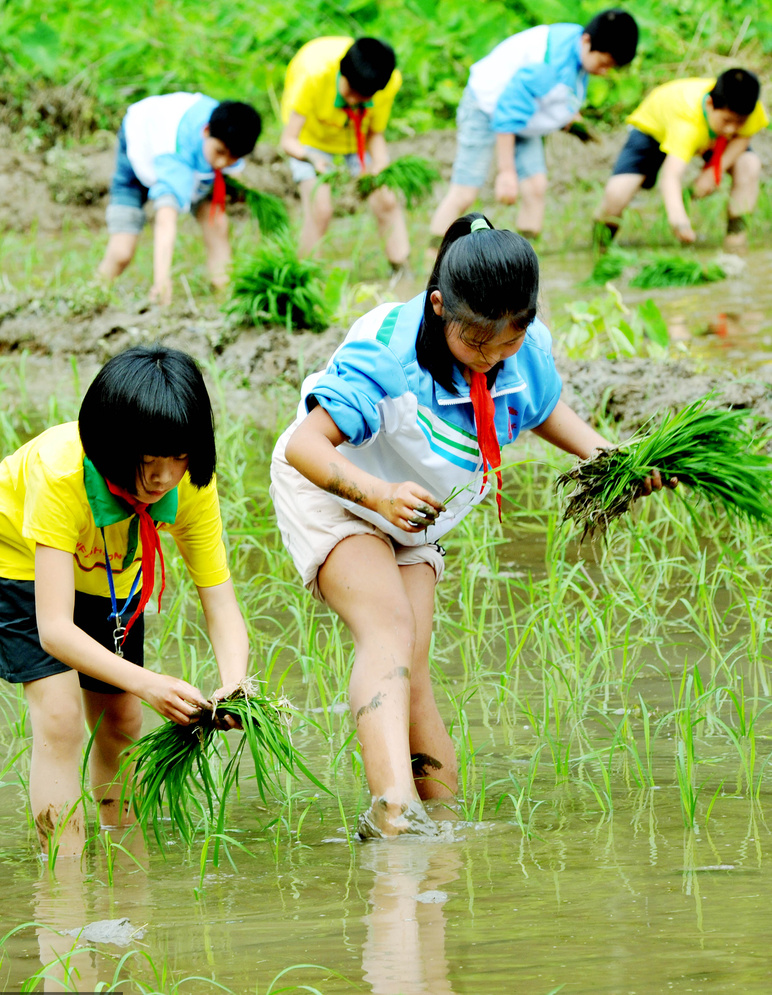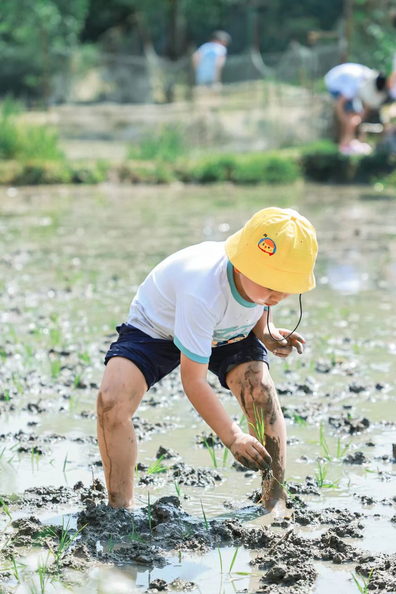 小朋友们下到田里,卷起裤脚,挽起衣袖,低着头弯着腰,一字排开,把手里的一棵棵秧苗插进泥土里,切实体会“谁知盘中餐,粒粒皆辛苦”的含义