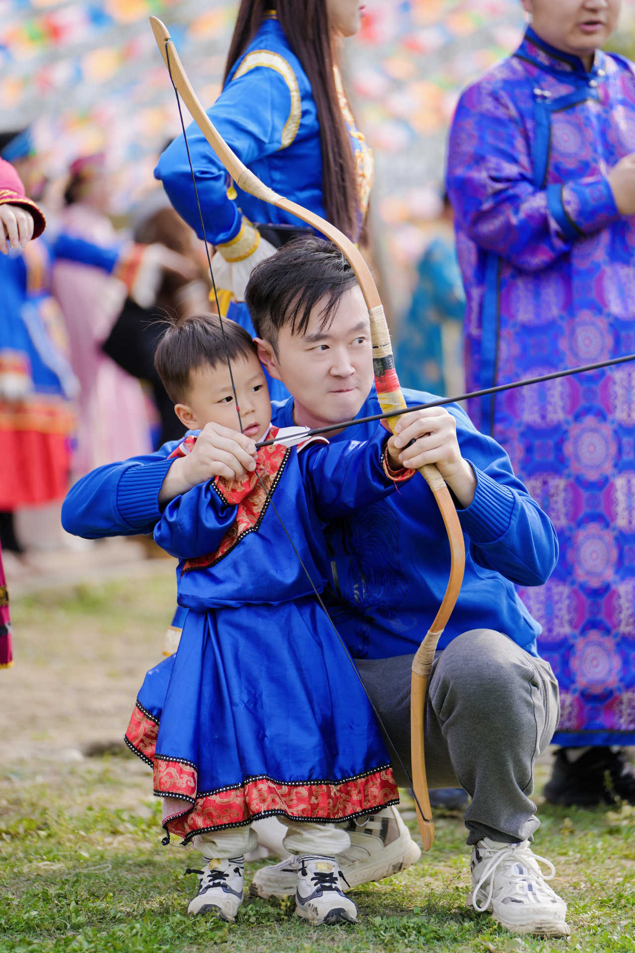 一场盛大的蒙古诈马宫廷宴即将开启。家长与小朋友身着绚丽蒙古服饰步入会场,巨大的蒙古包内,精美刺绣与彩带装点,满是浓郁民族气息。