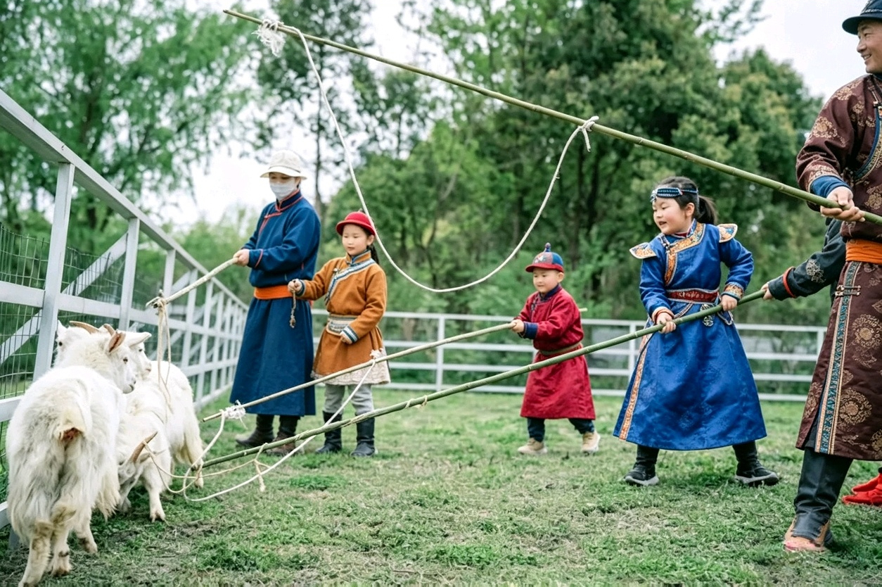 蒙古族师傅现场教学,手把手教小朋友们握绳、甩圈、瞄准等套羊技巧。孩子们手持套羊绳整齐排列在一旁,认真模仿练习,在轻松欢乐的氛围中感受游牧民族的传统技能,既锻炼手眼协调,又沉浸式体验草原民俗乐趣,收获别样研学快乐。